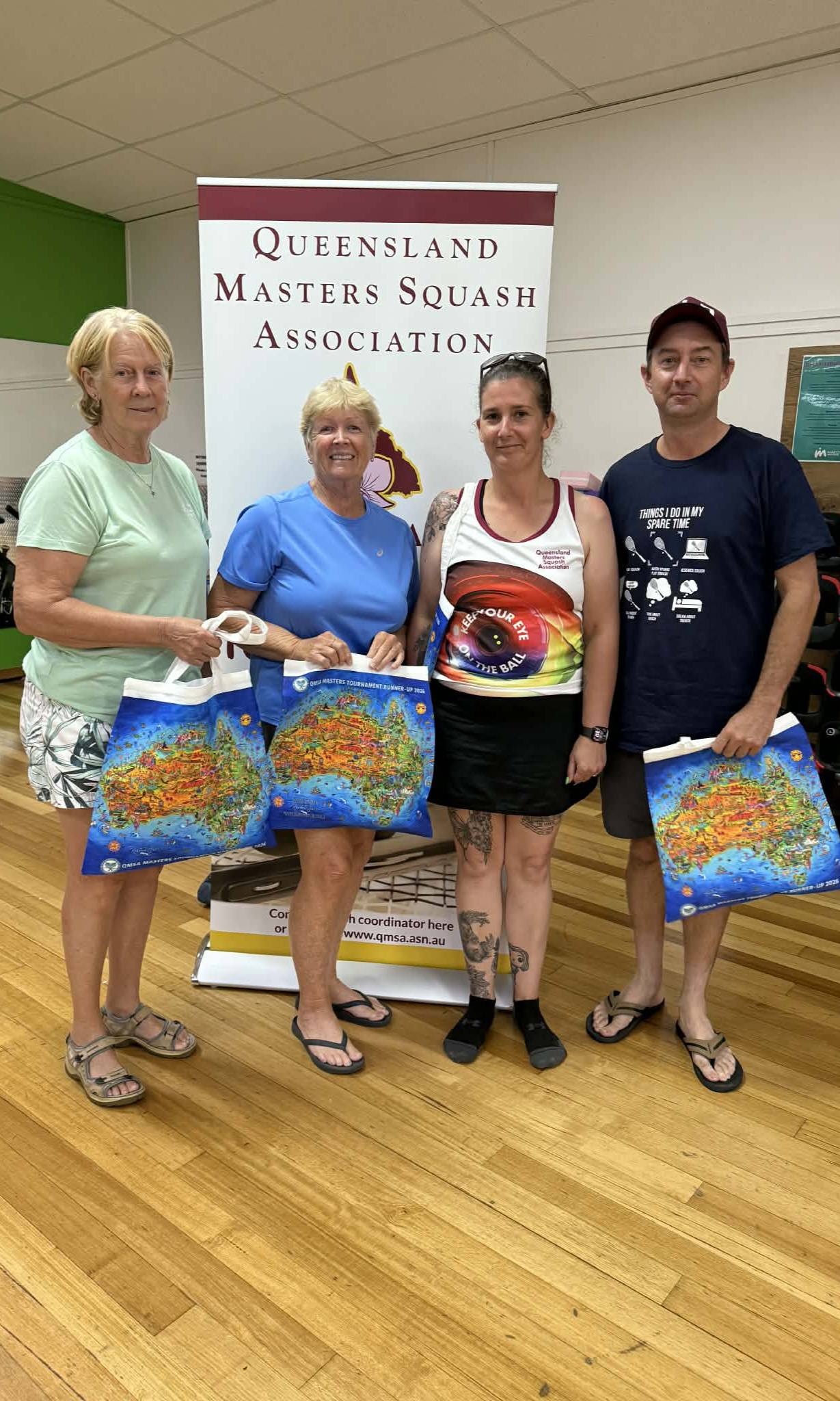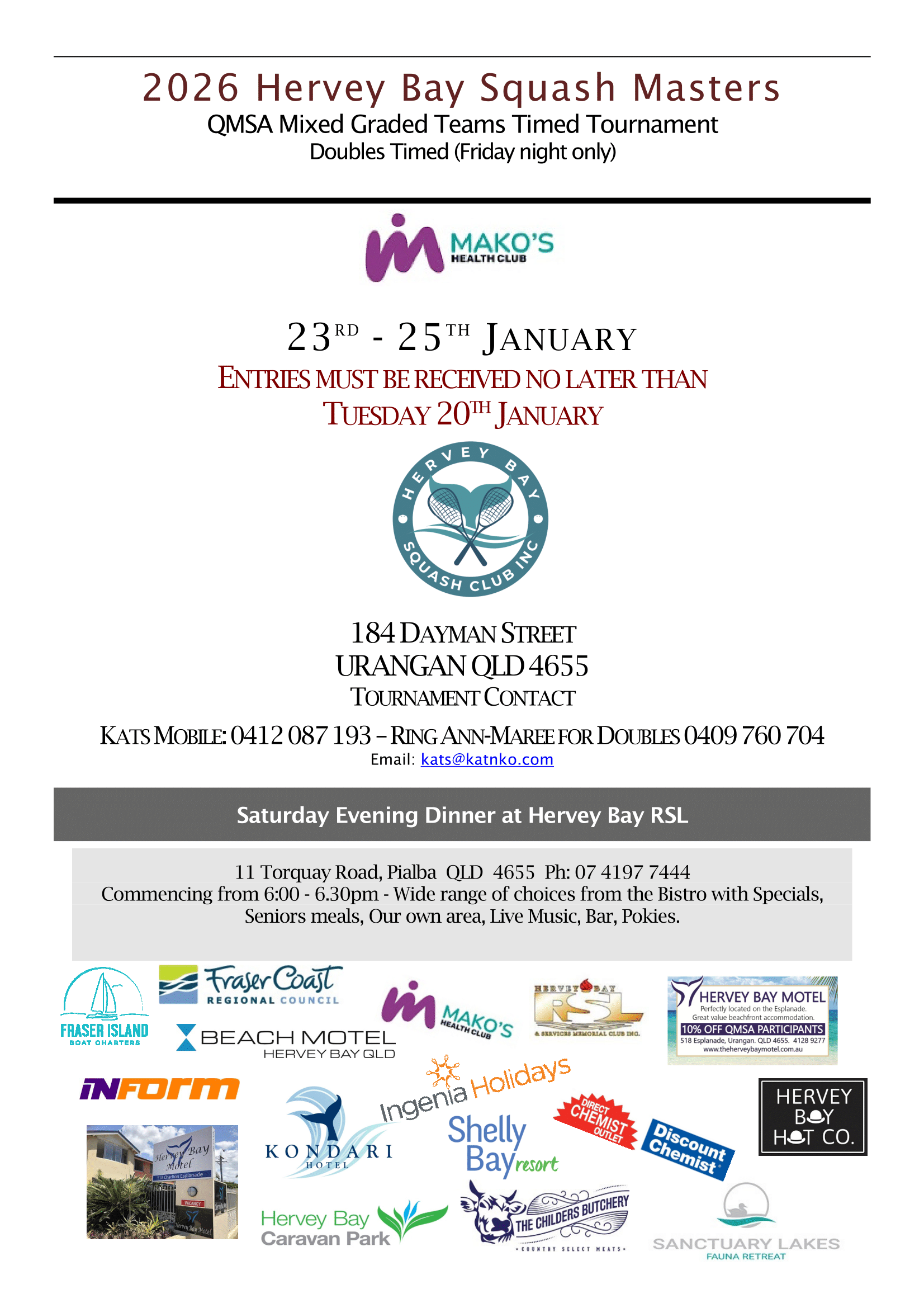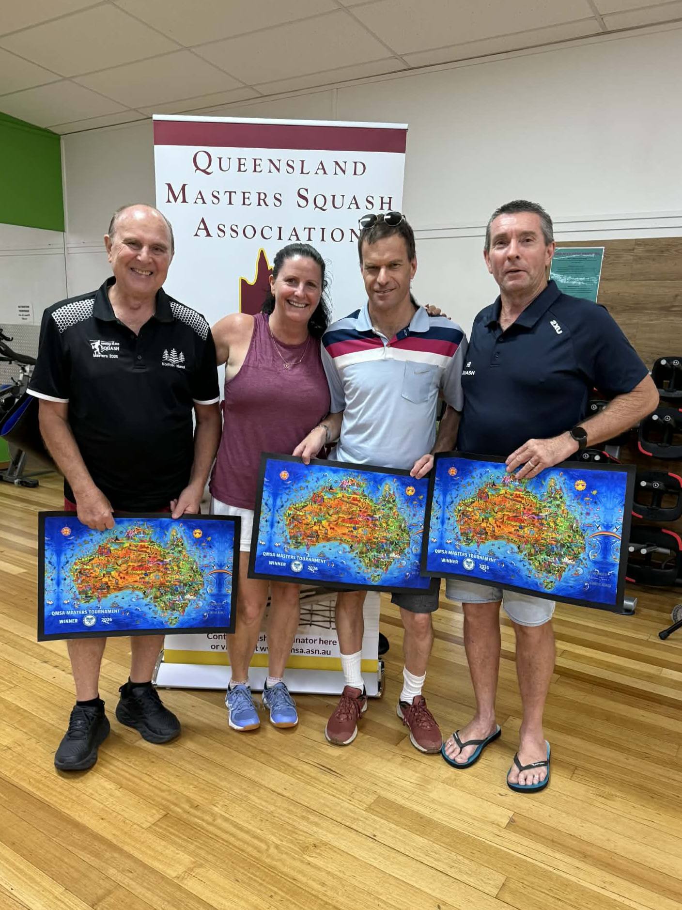 Welcome to the Queensland Masters Squash Association (QMSA) sanctioned tournament at Hervey Bay. This is one of the most eagerly awaited tournaments in our calendar. It is always a fun event, put together thoughtfully by Kathy for our members, and supported by our QMSA tournament team. Please see the poster for details including the Saturday Evening Dinner.