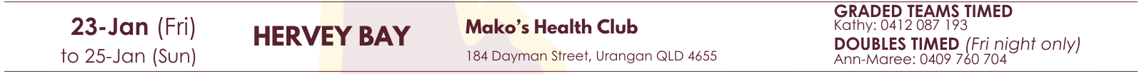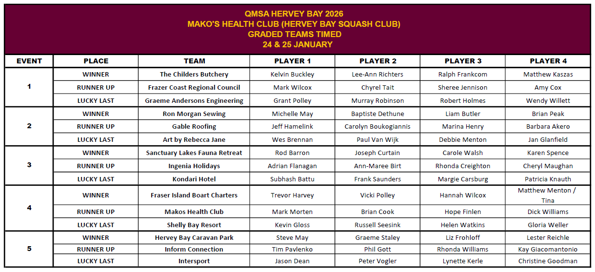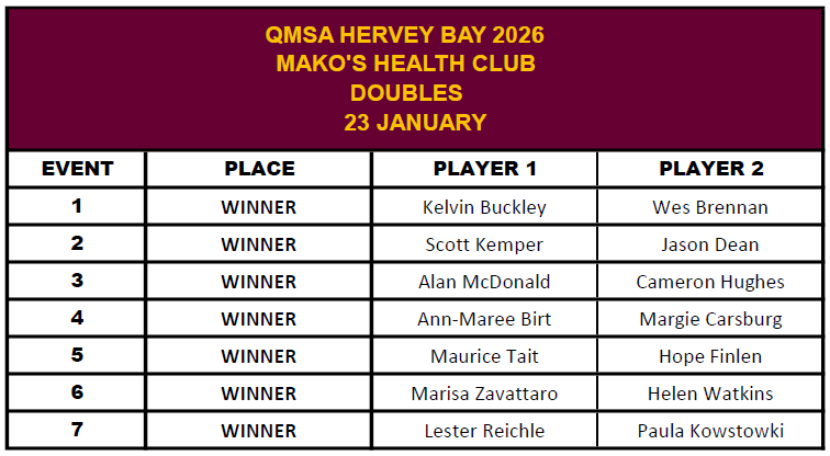 See tournament information, photos and results for the QMSA sanctioned Timed Teams and Doubles tournament at Mako's Health Club on 23rd, 24th and 25th January 2026.
