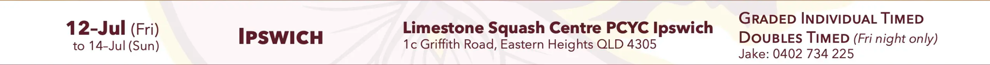 Follow this page for the QMSA sanctioned Doubles Timed and Graded Individual Timed tournaments at Limestone Squash Centre (Ipswitch PCYC) on Friday 12th, Saturday 13th and Sunday 14th of June 2024.