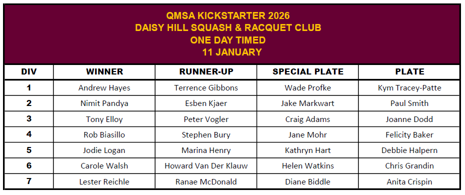 Happy New Year and welcome to the Queensland Masters Squash Association (QMSA) sanctioned tournament at Daisy Hill Squash Club. It is our first tournament for the calendar year 2026. Join us to kick things off for the year!
